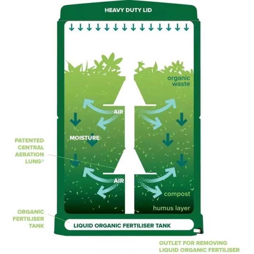 Ideal for larger establishments like restaurants and businesses, the 600 litre Aerobin ensures the quick decomposition of organic matter, facilitated by a central aeration lung. This unit is vermin resistant and features a moisture recirculation system that keeps the composting process active. The base includes a leachate tank to collect valuable liquid nutrients, essential for plant health. Remember, the Aerobin performs optimally when at least half-filled and is not suitable for glossy printed materials.