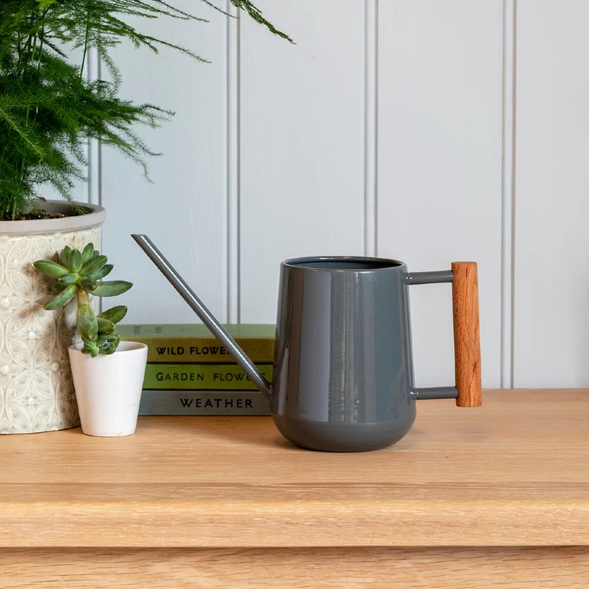 A watering can to be displayed on the windowsill. Minimalist clean lines in a gorgeous charcoal colour complement the beech wood handle. Houseplant watering never looked so stylish.