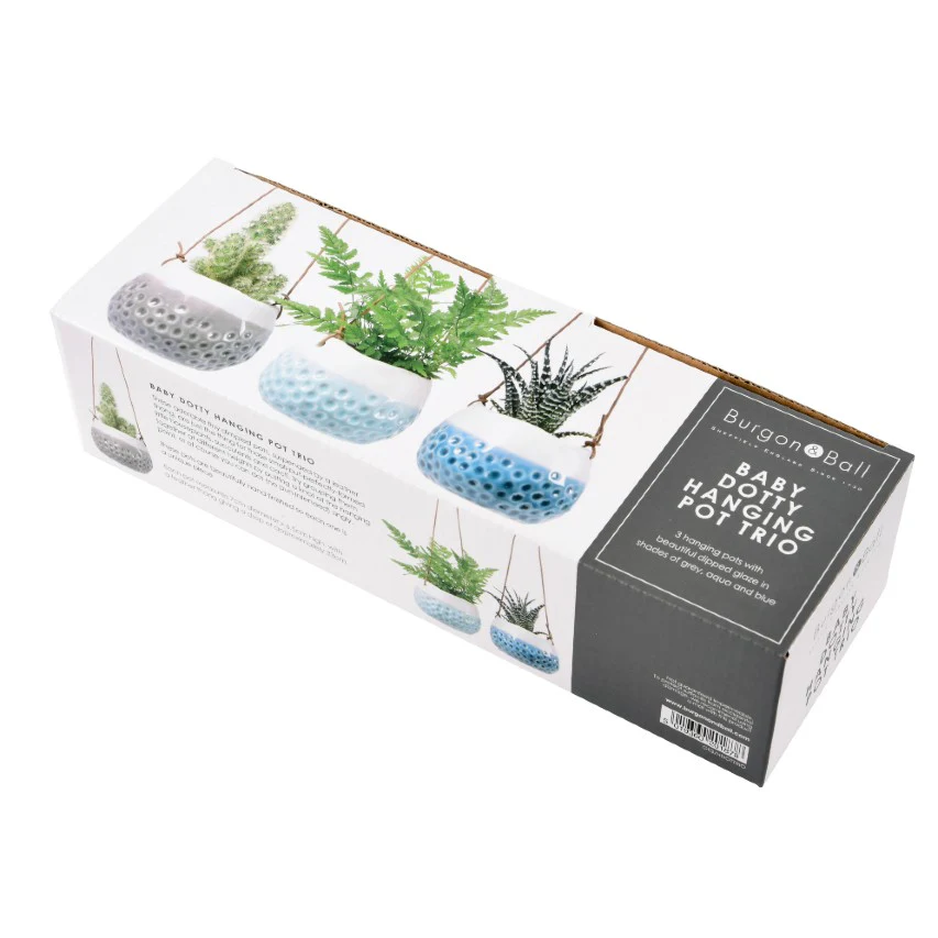 Baby Dotty is an adorably tiny hanging indoor pot, just perfect for those small-but-perfectly-formed baby succulents. It has a charming hand-crafted feel, with a slightly wavy edge to the rim. On the lower half of each pot there’s a beautiful dip-glaze, which accentuates the interesting dimpled texture.